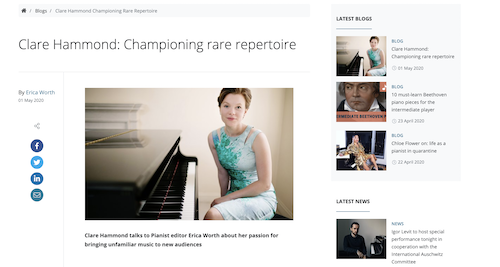 'And then came Clare Hammond. Her performance of Mozart's E flat piano quartet K493 was exemplary. She was absolutely confident from the very first, decisive notes of the Allegro, which she projected boldly, sacrificing none of its youthful joyfulness. There was lovely shaping of phrases... [and] in the slow movement, Miss Hammond's playing was expressive but always with a strong sense of direction. Here... there were some winning question and answer passages between soloist and strings and a genuine intensity developed towards the end of the movement which came all too soon. The concerto-like finale was pure delight. The pianist was in full command, her playing by turns lyrically elegant and masterfully assured. Clare Hammond has a bright future. My only regret was that we couldn't have Mozart's other piano quartet after the interval.'